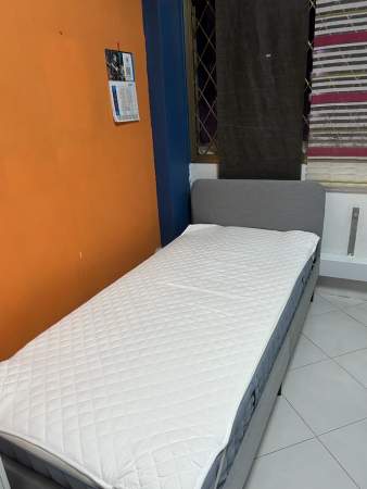 Single bed, wardrobe, table, chair, standing fan provided,