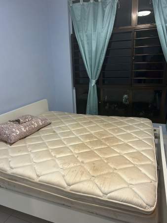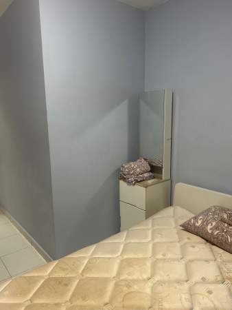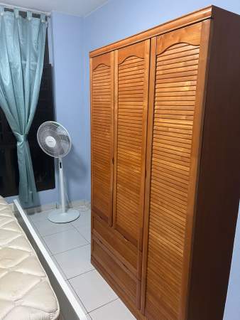 Queen size bed, wardrobe, table, chair, standing fan provided,
