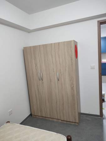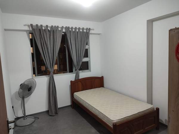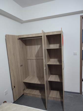 2 single beds, wardrobe, table, chair and standing fan provided,