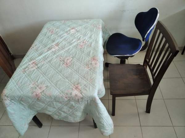 Queen size bed, wardrobe, table, chair, standing fan provided,