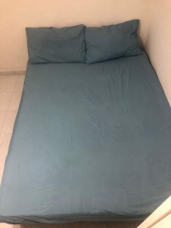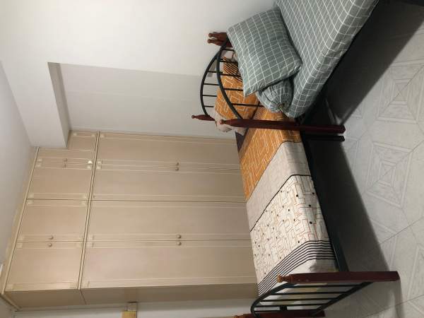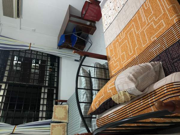 A spacious and privacy room with furnished (a queen size bed / 2 Single beds, a standing fan, a study table a chair and an iron are provided).