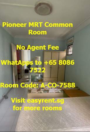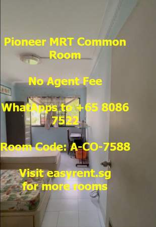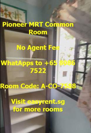 Room Code: A-CO-7588 813 JURONG WEST STREET xxxx0813 Near Pioneer MRT M.@.L.E & F.E.M.@.L.E welcome Nice C.H.I.N.@.S.E owner PUB/Utilities (Water & electricity) included - Yes ***Rental price depend on tenant profile, move-in date, lease duration, tenant requests Common Room 1pax - $800 - $900 Common Room 2pax - $1000 - $1200 Common Room 3pax - $No Common Room 4pax - $No Minimum 6 months occupancy Owner prefer 12 months lease Availability: Immediate Air cons - Yes Cooking - Light Cooking Allowed (Instant Noodle, Boiling, Steaming .etc) (Less Oil, Less Odour, Minimal mess and cleaning requires) (Must Clean Up) Owner stay - Yes Environment - Adults Only Visitor - No Tenant's Pet - No Owner's�Pet - No WiFi - Yes Washing Machine - Yes Household size - 3pax - 5pax Common toilet users - 2 Water heater - Yes Whatapps +xxxx7522 No agent fee