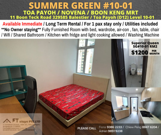 Available Immediately - Common Room/Include Utilities/Wifi/Aircon/No Agent Fee/Light Cooking Allowed/Washing Machine ____________________________________________ SUMMER GREEN - SG#10-01RM2 Location: 11 Boon Teck Road, #08-01, Singapore 329585 Balestier / Toa Payoh (D12) Price: $1200/1 pax Inclusive: - Shared monthly Utilities at $80/person - Shared Wifi in house for general usage - 2 times cleaning of common area monthly - Tenant WA weekday support - Aircon servicing Property type: Condo/ Apartment Room type: Common room For more rooms availability, please click here and contact us now for more info. https://bit.ly/3r9HlW3 Room amenities provided: - Bed frame and mattress - Wardrobe - Table and chair - Aircon and fan House Amenities provided: - Wifi - Kitchen with cooking stove, light cooking allowed - Fridge - Washing Machine - Water Heater - 1 or 2 Shared bathroom Nearby MRT Stations: ✅ (NS19) Toa Payoh: 15 min ✅ (NS20) Novena: 10 min Nearby Malls: Velocity @ Novena Square Zhongshan Mall Square 2 Nearby clinic: Raffles Medical Novena Novena Medical Center CONTACT: Direct call: ☎ Mrs. Fiona +xxxx2233 ☎ Ms. Chiew Peng +xxxx6204 ☎ Mr. Adrian +xxxx9238