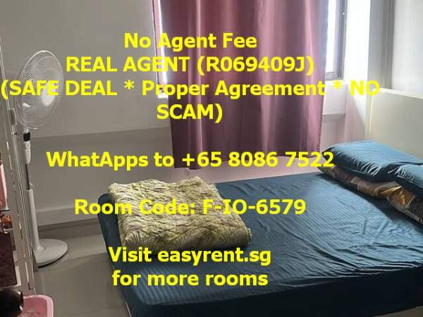 Room Code: F-IO-6579 Whampoa South 330049 Near Boon Keng MRT FEMALE ONLY Nice Indian owner PUB/Utilities (Water & electricity) included - Yes Common Room 1pax - $850 Common Room 2pax - $No Common Room 3pax - $No Common Room 4pax - $No Minimum 6 months occupancy Owner prefer 12 months lease Availability: May 1st Air cons - Yes Cooking - Light Cooking Allowed (Instant Noodle, Boiling, Steaming .etc) (Less Oil, Less Odour, Minimal mess and cleaning requires) (Must Clean Up) Owner stay - Yes Environment - Young Family Without Kid Visitor - No Tenant's Pet - No Owner's�Pet - No WiFi - Yes Washing Machine - Yes Household size - 1pax - 3pax Common toilet users - 2 Water heater - Yes Whatapps +xxxx7522 No agent fee